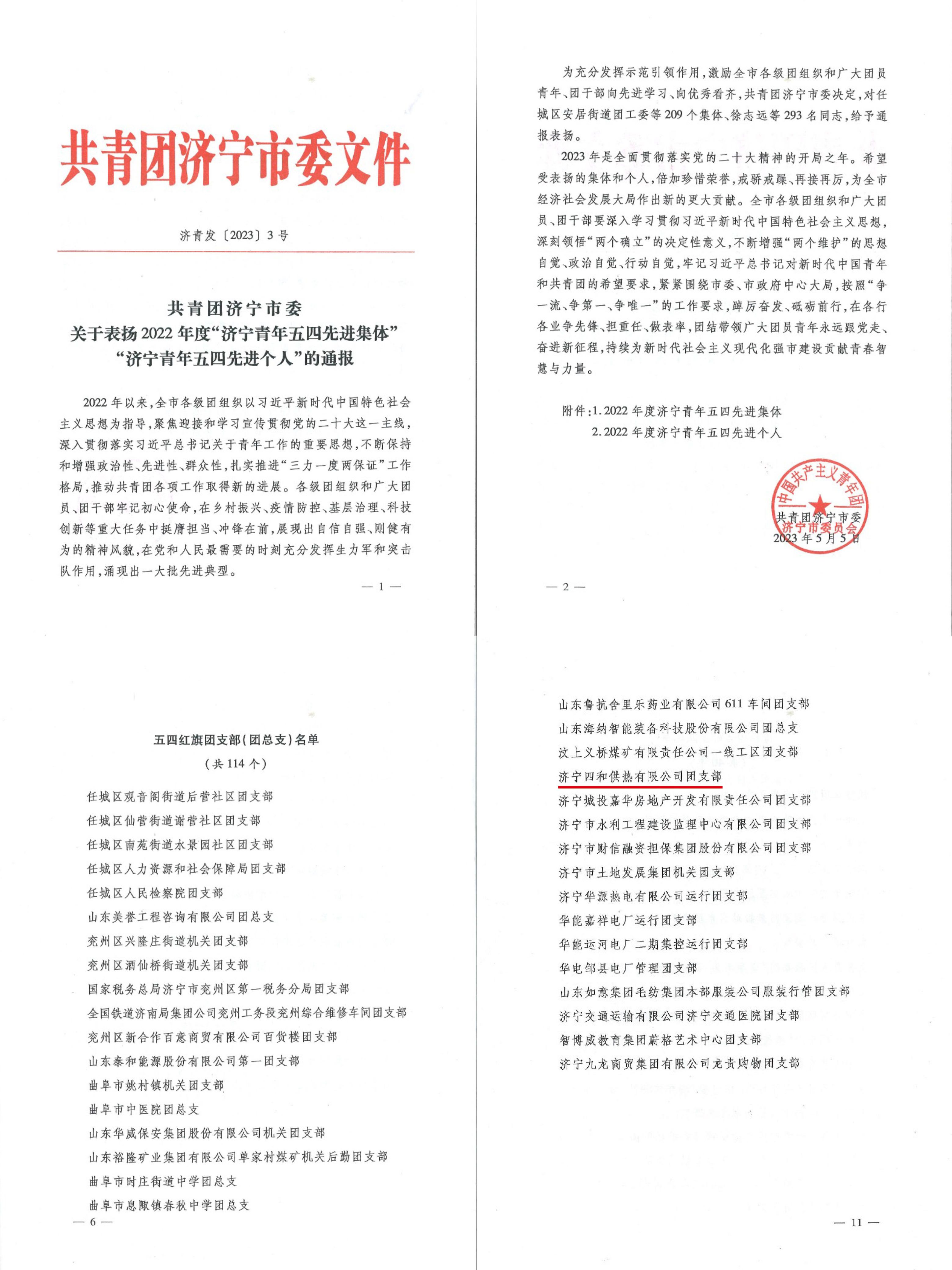 近日,共青團(tuán)濟(jì)寧市委印發(fā)了《關(guān)于表?yè)P(yáng)2022年度“濟(jì)寧青年五四先進(jìn)集體”“濟(jì)寧青年五四先進(jìn)個(gè)人”的通報(bào)》,濟(jì)寧四和供熱有限公司團(tuán)支部名列其中,獲評(píng)“濟(jì)寧市五四紅旗團(tuán)支部”。
