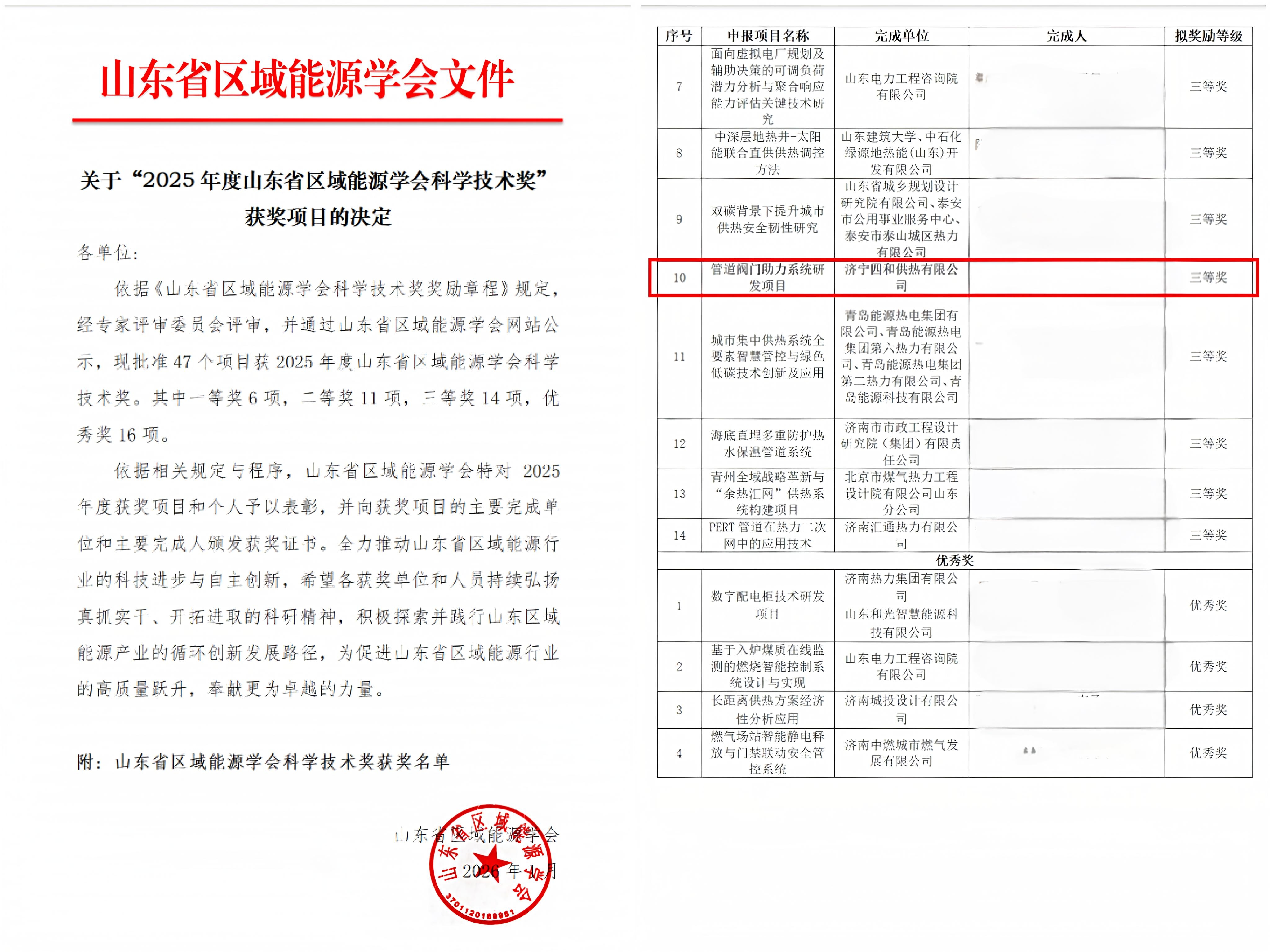 近日,2025年度山東省區(qū)域能源學(xué)會(huì)科學(xué)技術(shù)獎(jiǎng)獲獎(jiǎng)項(xiàng)目名單正式公示,濟(jì)寧四和供熱有限公司自主研發(fā)的管道閥門助力系統(tǒng)項(xiàng)目憑借突出的技術(shù)創(chuàng)新與應(yīng)用價(jià)值,成功獲得科學(xué)技術(shù)獎(jiǎng)三等獎(jiǎng),這是對(duì)四和供熱公司技術(shù)研發(fā)實(shí)力和成果轉(zhuǎn)化能力的高度認(rèn)可。